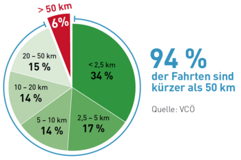 34 % sind kürzer als 2,5 km, 17 % liegen zwischen 2,5 und 5 km, 43 % zwischen 5 und 50 km. Nur 6 % sind länger als 50 km. 94 % der täglichen Wege sind somit kürzer als 50 km.