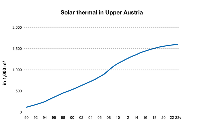 Upper Austria is the number one solar region in Austria and has also a leading position in Europe with 1 m² of collector surface per inhabitant. On the whole 1,598,000 m² solar thermal collectors are installed in Upper Austria. In 2023 alone, more than 11,000 m² were installed. Solar thermal systems are commonly utilized for domestic hot water production but increasingly being configured to provide space heat as well. In the future, solar process heat and solar cooling will also play a more prominent role.