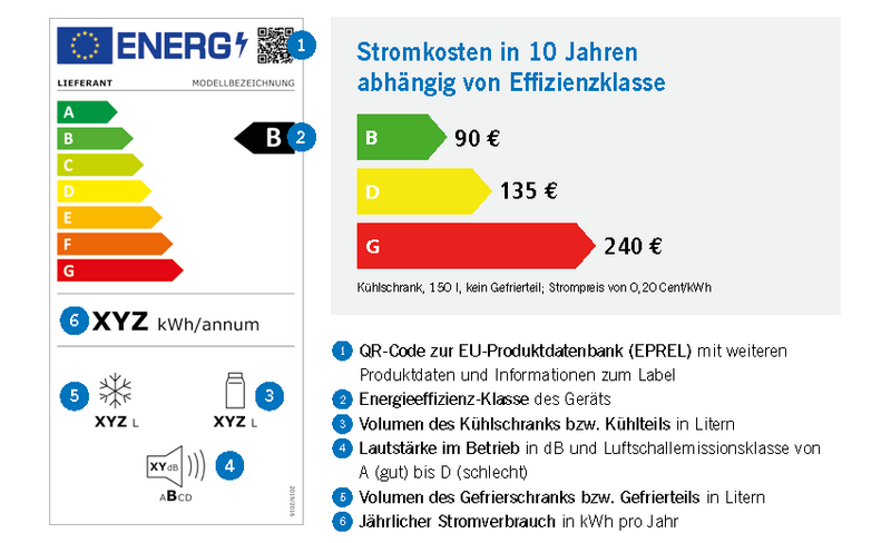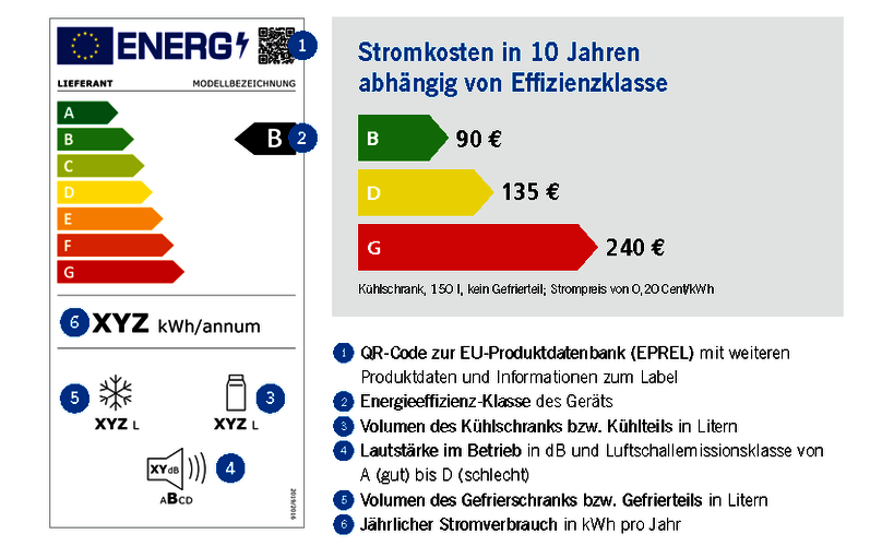 Das neue Energie-Pickerl bewertet auf einer Skala von A (gut) bis G (schlecht). An die besten Energieeffizienz-Klassen werden sehr hohe Anforderungen gestellt. Kaufen Sie Geräte der besten Effizienzklasse, die bereits angeboten wird.