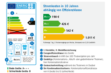 Vor allem ältere Wäschetrockner verbrauchen viel Strom, bei einem Gerät der Effizienzklasse B sind es ca. 4,5 Kilowattstunden pro Trockengang. Bei effizienteren Wärmepumpentrocknern der Klasse A+++ oder A++ beträgt der Stromverbrauch ca. ein Drittel.