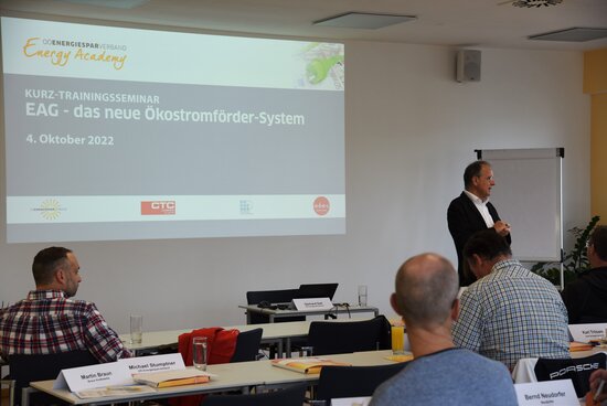 Im Kurz-Trainingsseminar wurde den 25 TeilnehmerInnen, neben den Investitionsförderungen, unter anderem das Marktprämiensystem erläutert, der Unterschied zwischen einer wettbewerblich und einer administrativ ermittelten Prämie vorgestellt und die Grundsätze einer variablen Marktprämie und einem