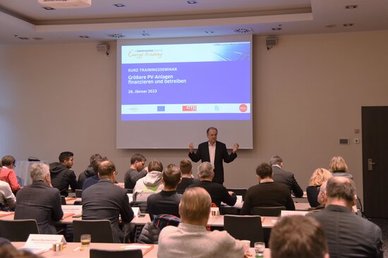 Schwerpunkte des Kurz-Trainingsseminars mit 46 TeilnehmerInnen waren unterschiedliche innovative Möglichkeiten, PV-Anlagen zu finanzieren und zu betreiben und dabei die eigenen Investitionskosten gering zu halten. Die Palette umfasste u.a. Eigenverbrauchsanlagen, Beteiligungsmodelle, Energie-Contracting, PV-Gemeinschaftsanlagen sowie Energiegemeinschaften. Förderungen und Praxisbeispiele ergänzten das Programm.